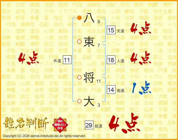 あなたの人生を表す1番重要な運勢です。生涯を通じて影響する総合運となり、主に50歳以降の晩年期に影響を及ぼします。苗字と名前の合計画数。