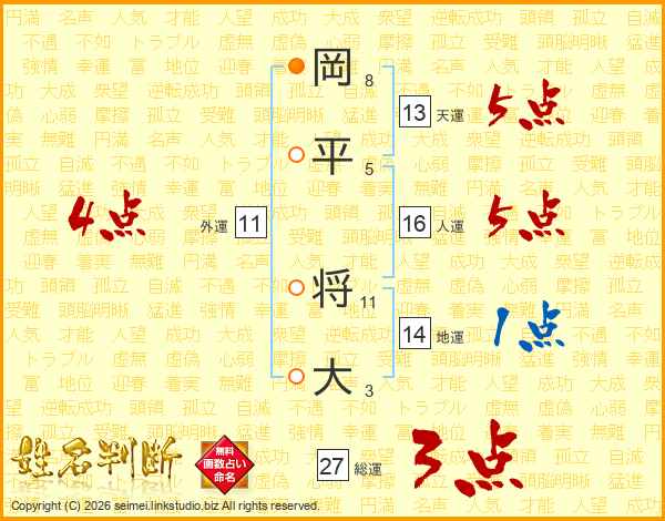 あなたの人生を表す1番重要な運勢です。生涯を通じて影響する総合運となり、主に50歳以降の晩年期に影響を及ぼします。苗字と名前の合計画数。