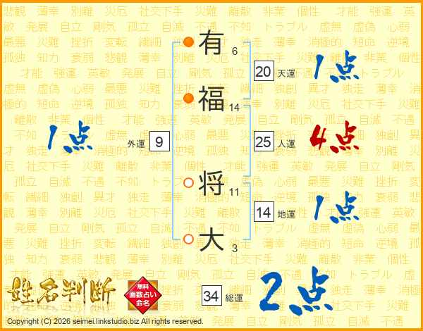 生活面を象徴する運勢です。外部から受ける影響力を表し、結婚運、家庭運や職場、環境への順応性を表します。総運から人運を引いた画数。姓や名が1文字の場合を除く。
