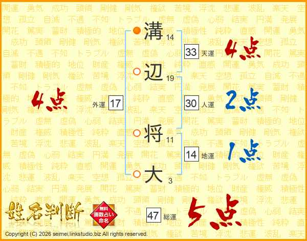 生活面を象徴する運勢です。外部から受ける影響力を表し、結婚運、家庭運や職場、環境への順応性を表します。総運から人運を引いた画数。姓や名が1文字の場合を除く。