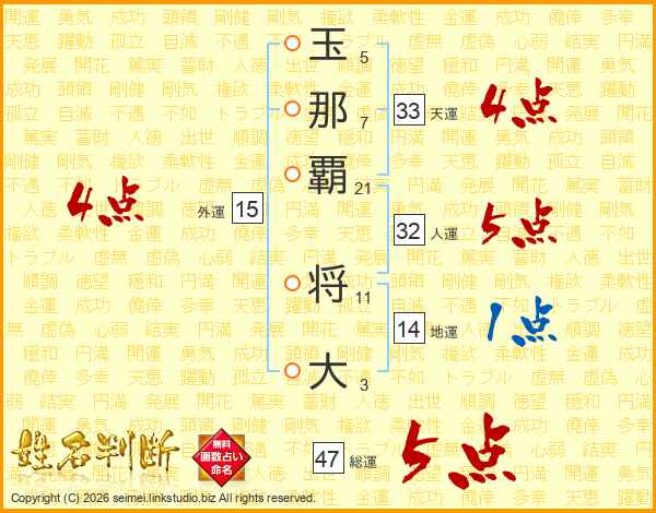 玉(5画)那(7画)覇(21画) 将(11画)大(3画)