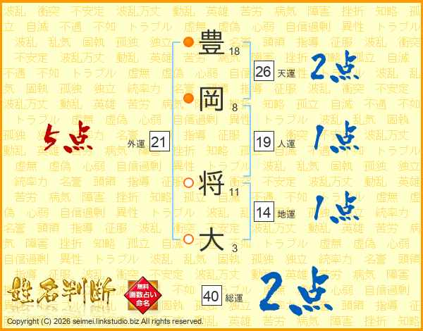 豊(18画)岡(8画) 将(11画)大(3画)