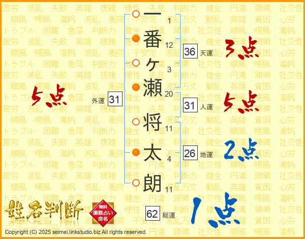 一(1画)番(12画)ヶ(3画)瀬(20画) 将(11画)太(4画)朗(11画)
