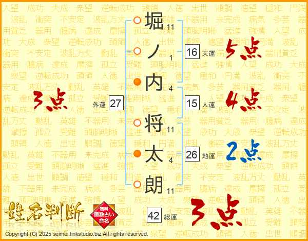 堀(11画)ノ(1画)内(4画) 将(11画)太(4画)朗(11画)