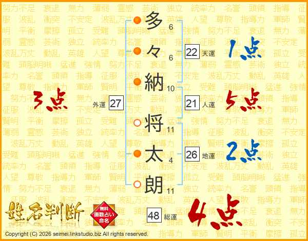 多(6画)々(6画)納(10画) 将(11画)太(4画)朗(11画)