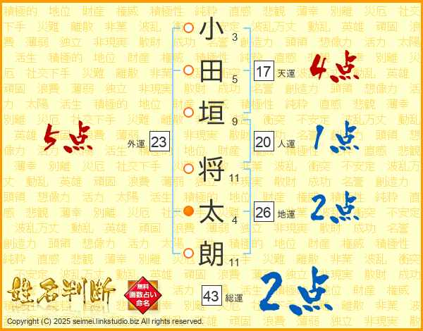 小(3画)田(5画)垣(9画) 将(11画)太(4画)朗(11画)