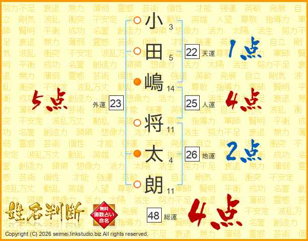 小(3画)田(5画)嶋(14画) 将(11画)太(4画)朗(11画)