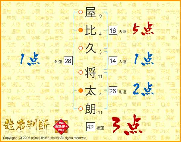 屋(9画)比(4画)久(3画) 将(11画)太(4画)朗(11画)