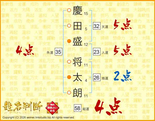 慶(15画)田(5画)盛(12画) 将(11画)太(4画)朗(11画)