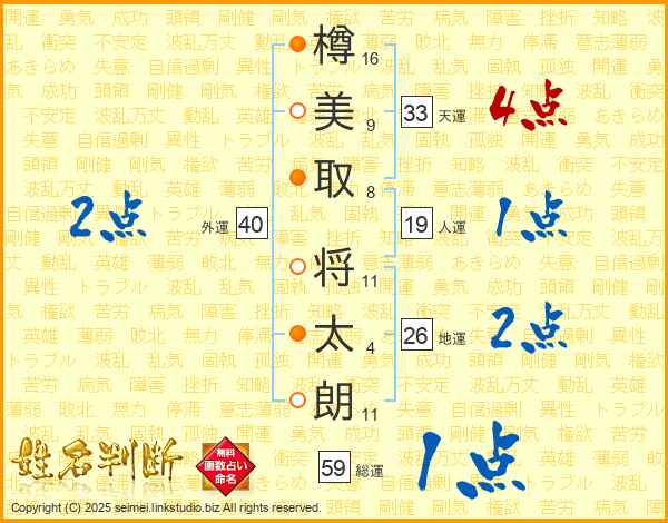 樽(16画)美(9画)取(8画) 将(11画)太(4画)朗(11画)
