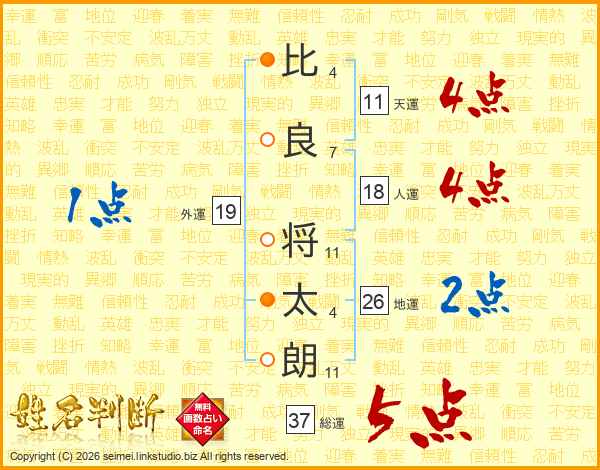 比(4画)良(7画) 将(11画)太(4画)朗(11画)