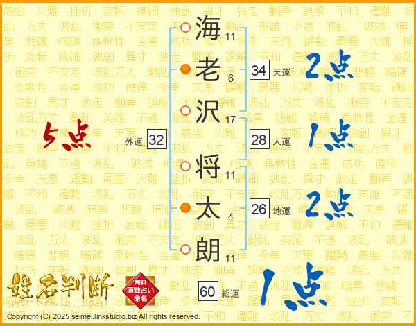 海(11画)老(6画)沢(17画) 将(11画)太(4画)朗(11画)