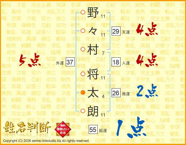 野(11画)々(11画)村(7画) 将(11画)太(4画)朗(11画)