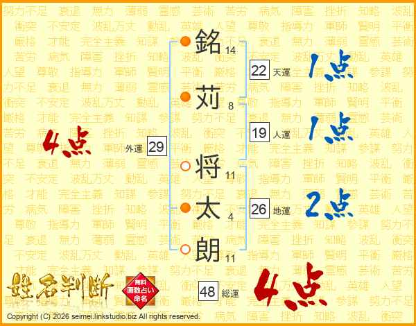 銘(14画)苅(8画) 将(11画)太(4画)朗(11画)