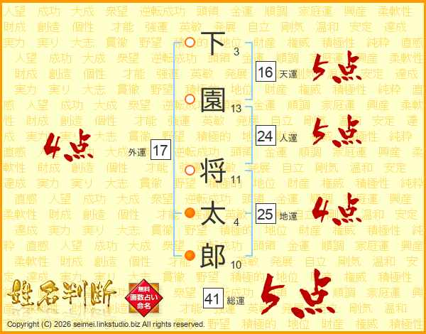 下園将太郎さんの総運は41画の5点!