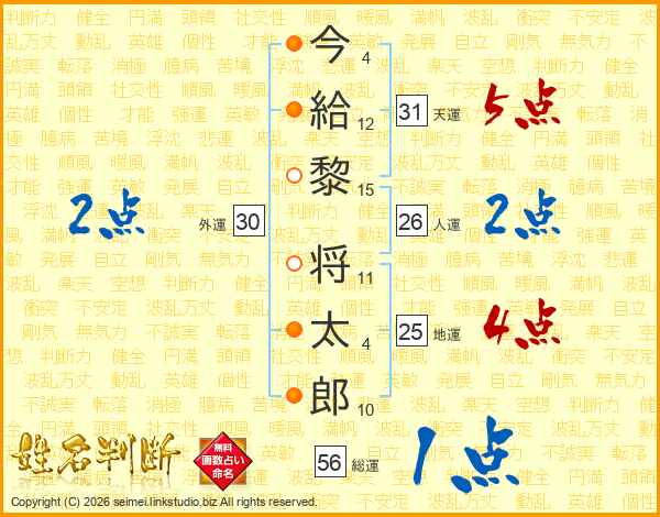 今(4画)給(12画)黎(15画) 将(11画)太(4画)郎(10画)