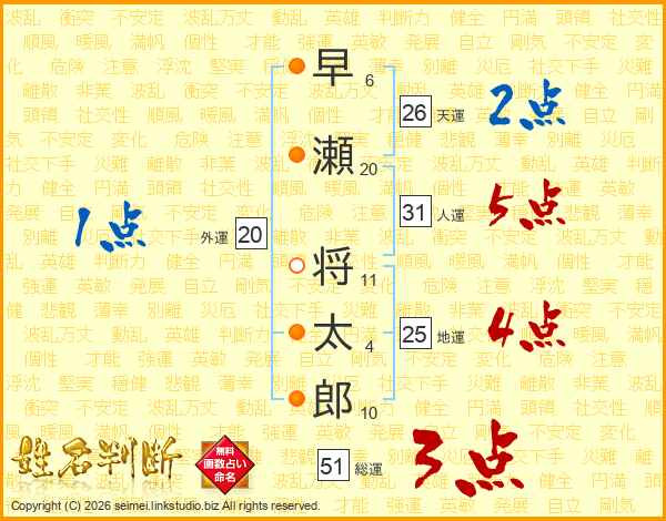 早(6画)瀬(20画) 将(11画)太(4画)郎(10画)