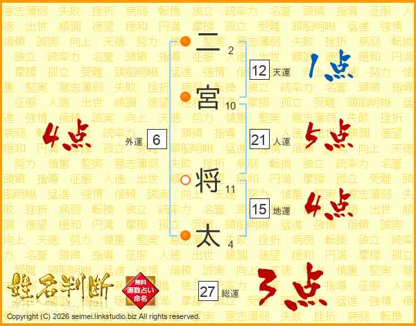 生活面を象徴する運勢です。外部から受ける影響力を表し、結婚運、家庭運や職場、環境への順応性を表します。総運から人運を引いた画数。姓や名が1文字の場合を除く。