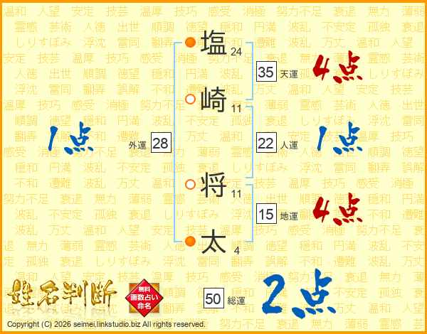 塩(24画)崎(11画) 将(11画)太(4画)