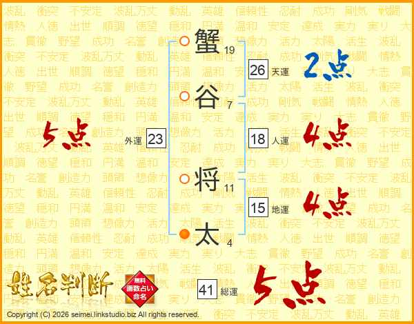 蟹(19画)谷(7画) 将(11画)太(4画)