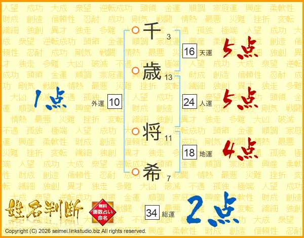 千歳将希さんの総運は34画の2点!