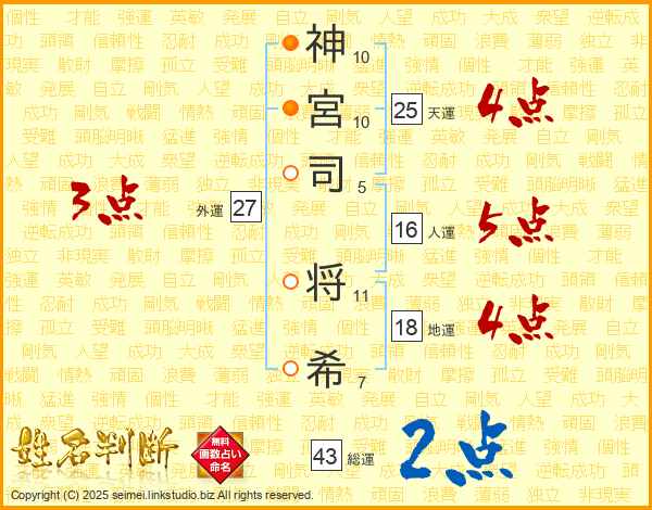 神(10画)宮(10画)司(5画) 将(11画)希(7画)