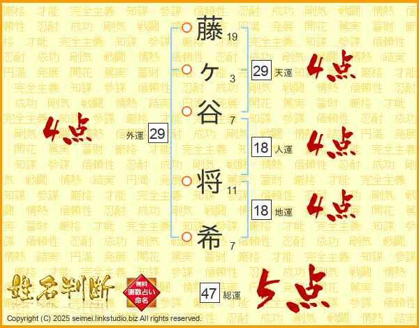 藤(19画)ヶ(3画)谷(7画) 将(11画)希(7画)