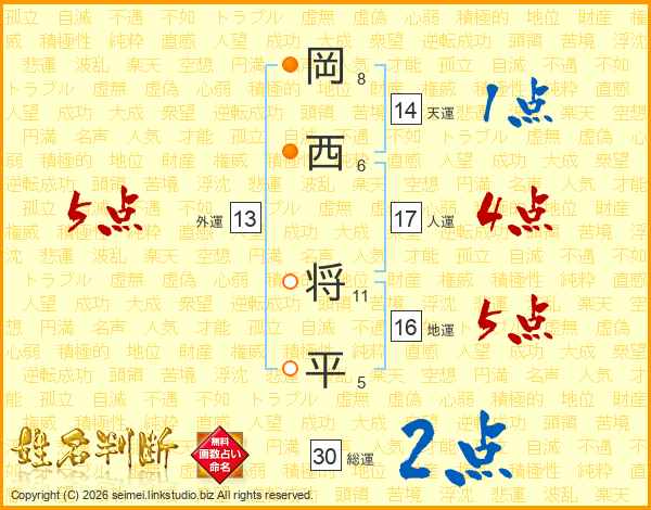 生活面を象徴する運勢です。外部から受ける影響力を表し、結婚運、家庭運や職場、環境への順応性を表します。総運から人運を引いた画数。姓や名が1文字の場合を除く。