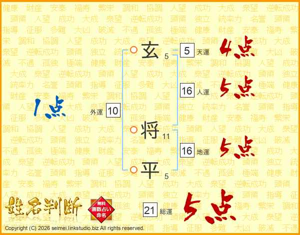 玄将平さんの総運は21画の5点!