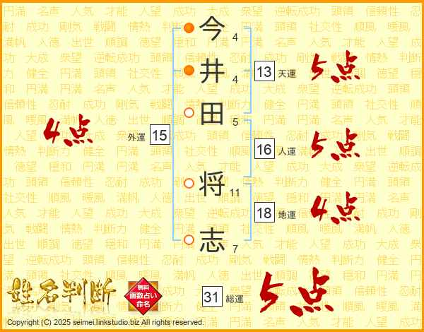 今井田将志さんの総運は31画の5点!