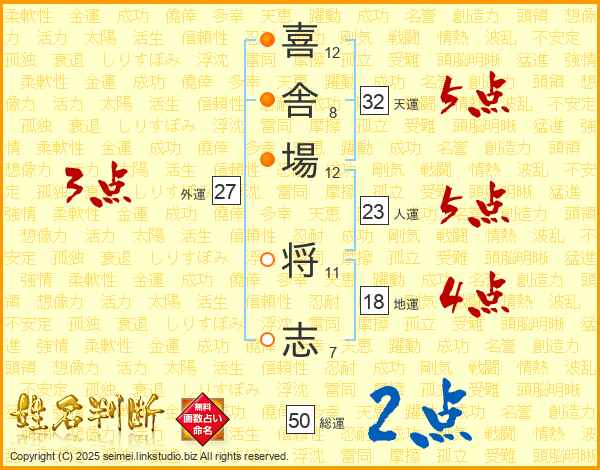 喜(12画)舎(8画)場(12画) 将(11画)志(7画)