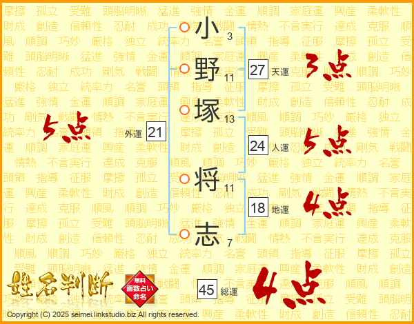 小野塚将志さんの総運は45画の4点!