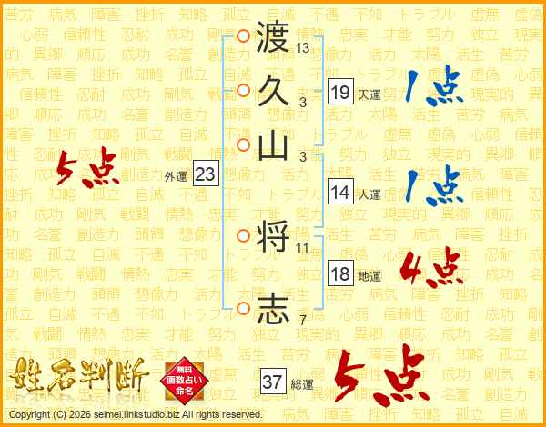 渡(13画)久(3画)山(3画) 将(11画)志(7画)