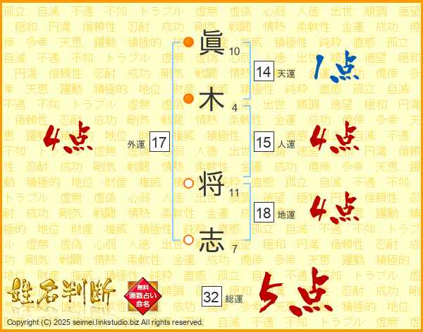 眞(10画)木(4画) 将(11画)志(7画)