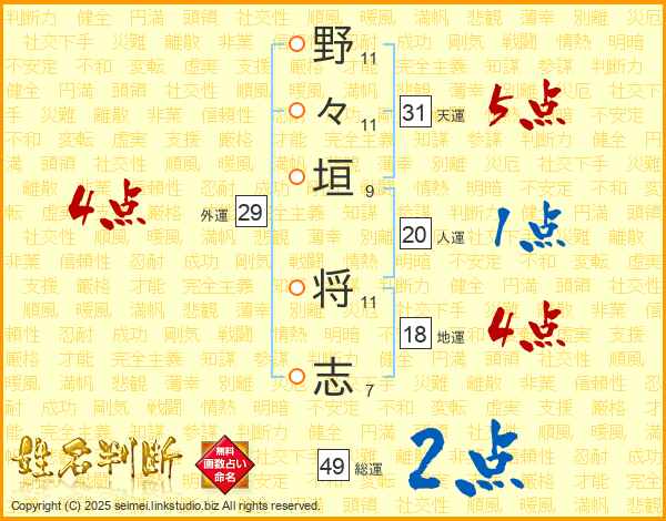 野(11画)々(11画)垣(9画) 将(11画)志(7画)