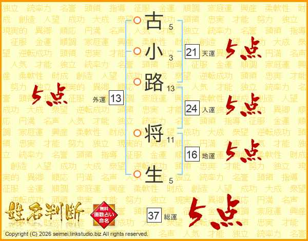 古(5画)小(3画)路(13画) 将(11画)生(5画)