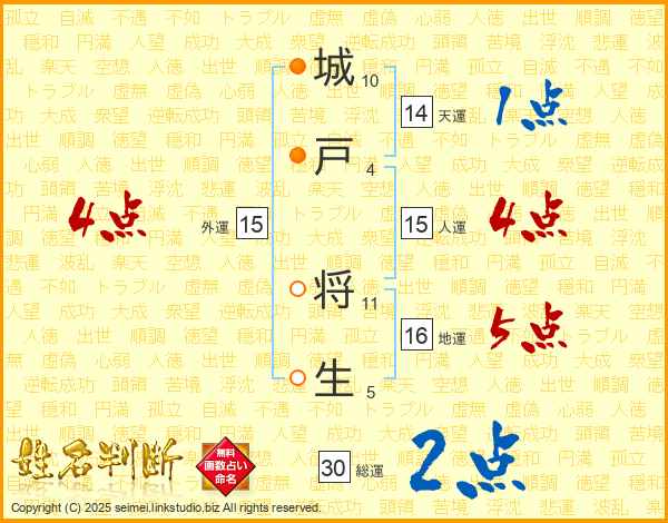 生活面を象徴する運勢です。外部から受ける影響力を表し、結婚運、家庭運や職場、環境への順応性を表します。総運から人運を引いた画数。姓や名が1文字の場合を除く。