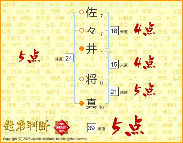佐(7画)々(7画)井(4画) 将(11画)真(10画)