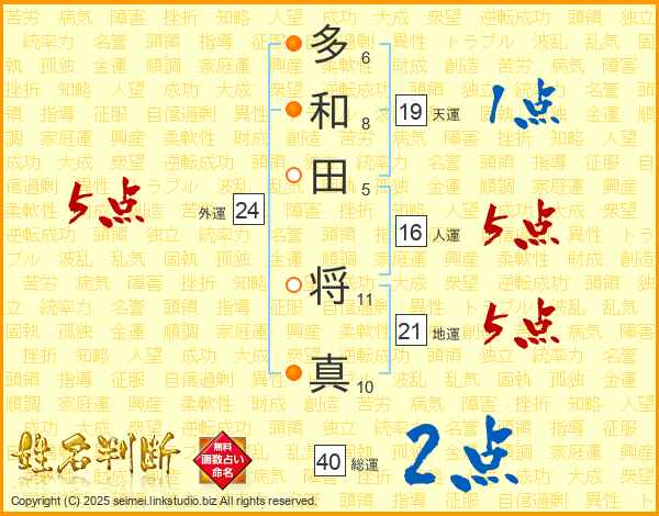 あなたの人生を表す1番重要な運勢です。生涯を通じて影響する総合運となり、主に50歳以降の晩年期に影響を及ぼします。苗字と名前の合計画数。