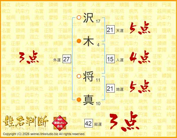 沢(17画)木(4画) 将(11画)真(10画)