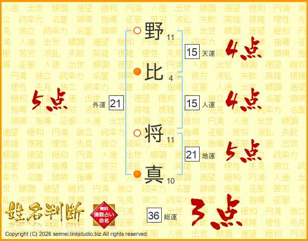 あなたの人生を表す1番重要な運勢です。生涯を通じて影響する総合運となり、主に50歳以降の晩年期に影響を及ぼします。苗字と名前の合計画数。