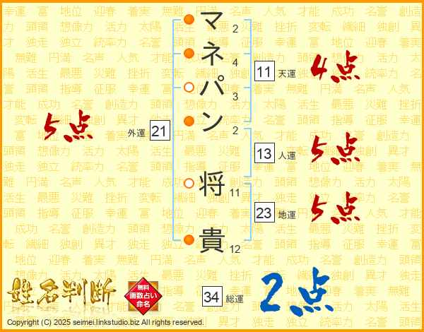マ(2画)ネ(4画)パ(3画)ン(2画) 将(11画)貴(12画)