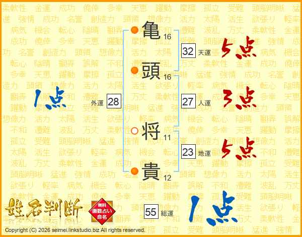 亀(16画)頭(16画) 将(11画)貴(12画)