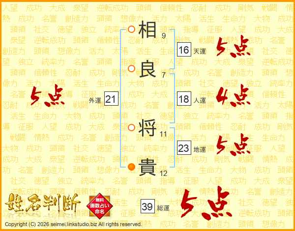 相(9画)良(7画) 将(11画)貴(12画)