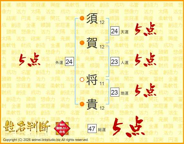 須(12画)賀(12画) 将(11画)貴(12画)