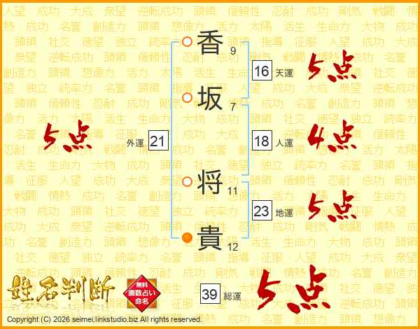香坂将貴さんの総運は39画の5点!