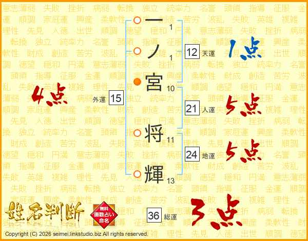 一ノ宮将輝さんの総運は36画の3点!