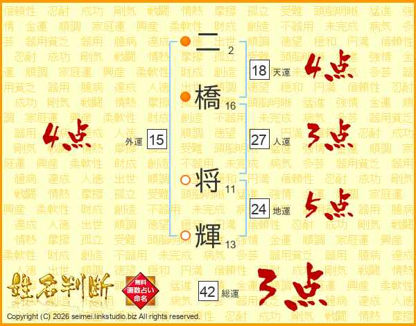二(2画)橋(16画) 将(11画)輝(13画)