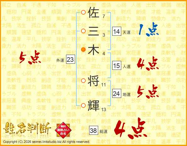 佐(7画)三(3画)木(4画) 将(11画)輝(13画)