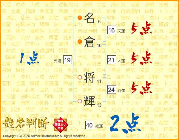 生活面を象徴する運勢です。外部から受ける影響力を表し、結婚運、家庭運や職場、環境への順応性を表します。総運から人運を引いた画数。姓や名が1文字の場合を除く。